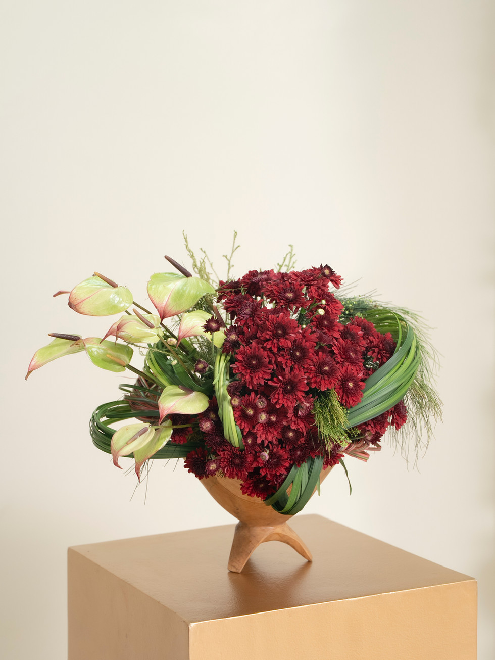 Bold Red Chrysanthemums, Green Anthurium, Agoho Leaves, Scarlet Leaves, Green Lace, Moss Brown and Green Moss on small Teak Root Bowl.
