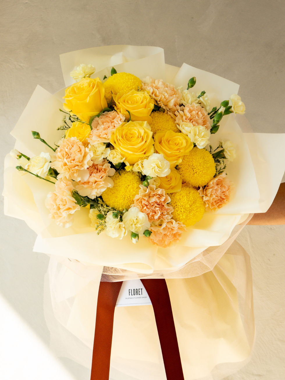 Yellow Roses, Carnations, Pingpong Mums, and Yellow Misty. Wrapped in Cream Packaging, Brown Grosgrain Ribbon.