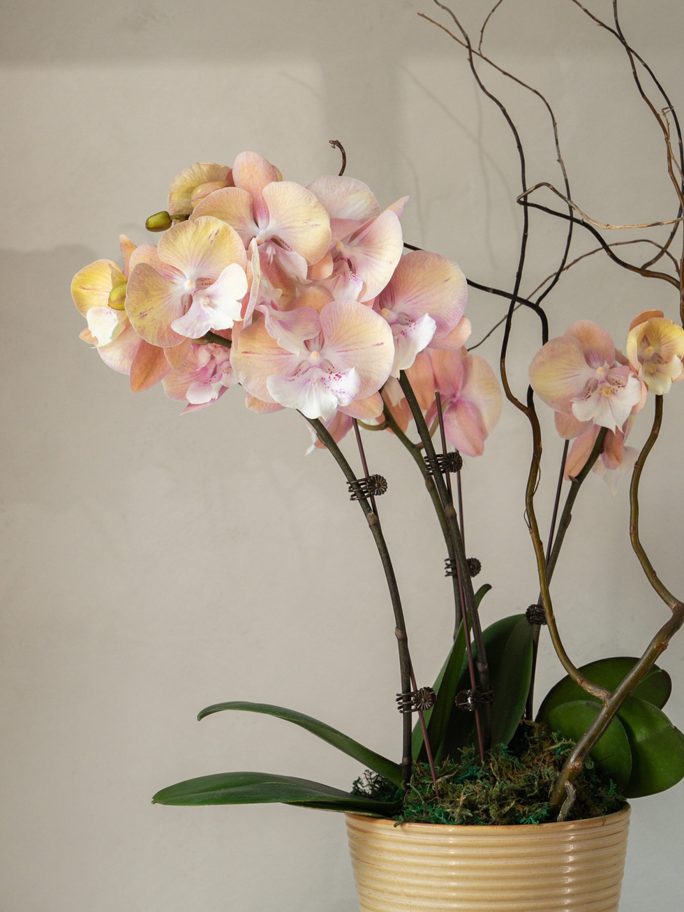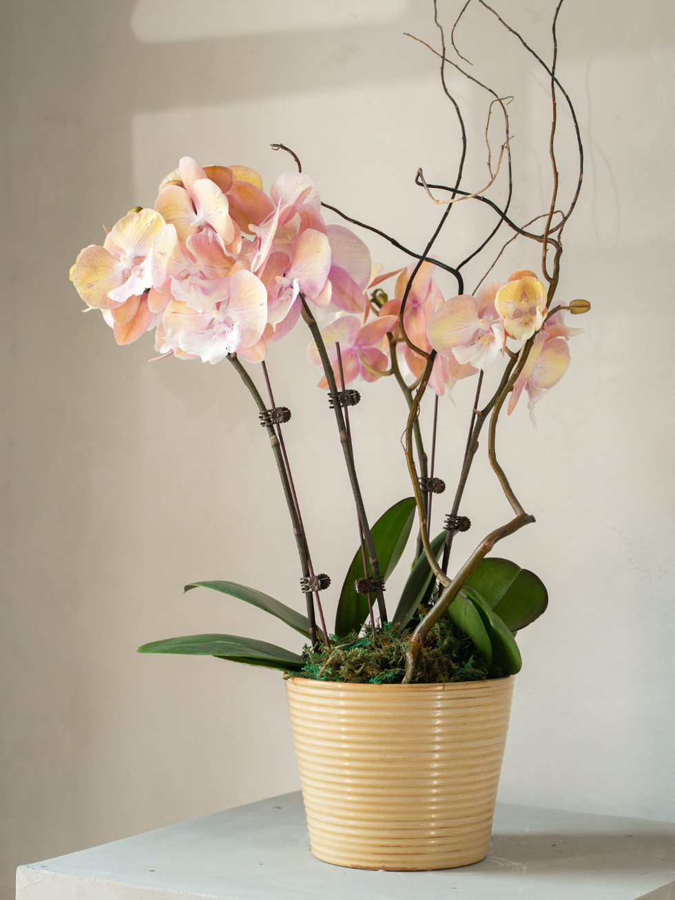 Pink Mini Phalaenopsis, Moss, and Curly Willow in a Beige Ribbed Vase.