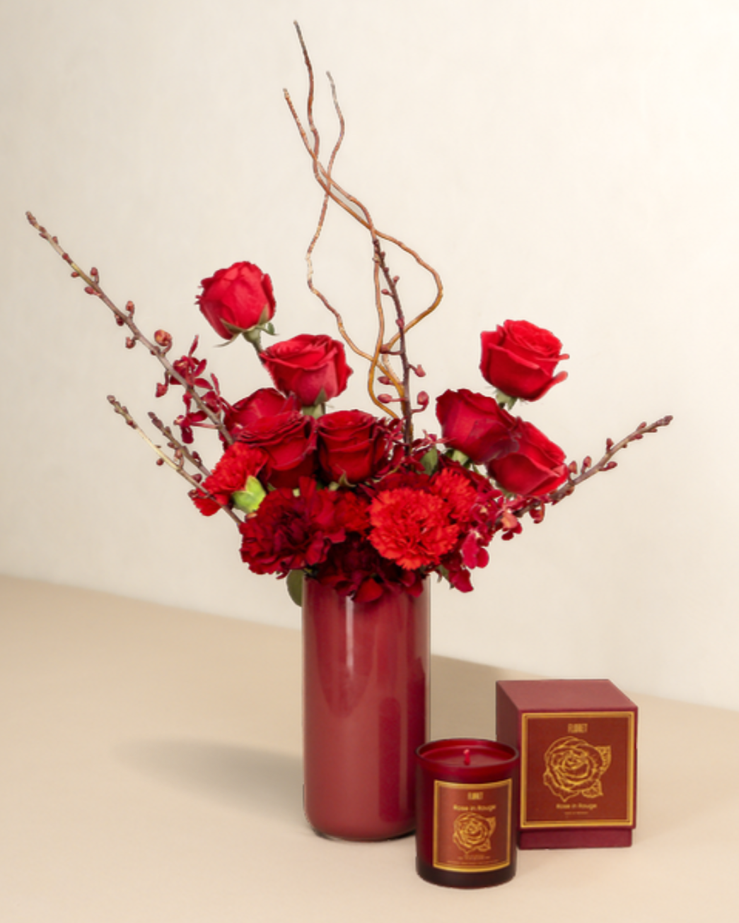The Rouge Vase Arrangement and Rose in Rouge Red Label Candles